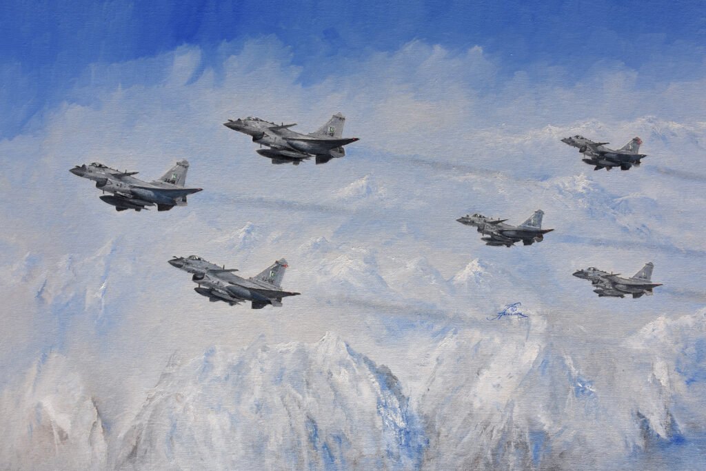 Hussaini Sahib’s exhibitions have been held in USA, Britain, Turkey, Islamabad, Karachi, Quetta, Peshawar, and Lahore. Undoubtedly these exhibitions attracted Pakistani Gen “Z” to join an illustriuos career in country. He is the only Pakistan Air Force officer to have been decorated with the “President’s Gold Medal for Pride of Performance” by the Government of Pakistan. The Pakistan Air Force has also honoured him with the “Lifetime Achievement Award” and the “Tamgha-e-Basalat.” Hussaini Sahib also completed his latest painting prepared for 23 March 2026, depicting the arrival of the J-10C aircraft in Pakistan on 4 March, 2022. He has aptly captioned this latest work “ENTER THE DRAGON.”Names of the six pilots are also mentioned below the painting. They include Officer Commanding No.15 Squadron, Wing Commander Imtiaz Rahim Shahzada, Wing Commander Bilal Raza, Squdron Leader Jibran Rashid, Squadron Leader Hasan Anees, Squadron Leader Zeeshan Mohammad, and Squadron Leader Ali Qasim.