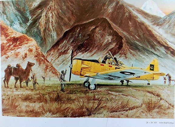 The painter smiled and said it was based on a real incident. On 14 April 1948, the Pakistan Air Force provided support to the freedom fighters of Gilgit–Skardu. The PAF was still in its infancy, and the civil administration requested assistance in delivering a mortar gun to the area. There was no runway or landing facility in Skardu or Gilgit. The nearby grassy lands leading to Skardu were connected to Gilgit only by a mule track, which remained blocked for most of the year. The Station Commander at PAF Station Risalpur, Wing Commander Asghar Khan (later Commander-in-Chief), tasked Flight Lieutenant Khyber Khan with the mission.