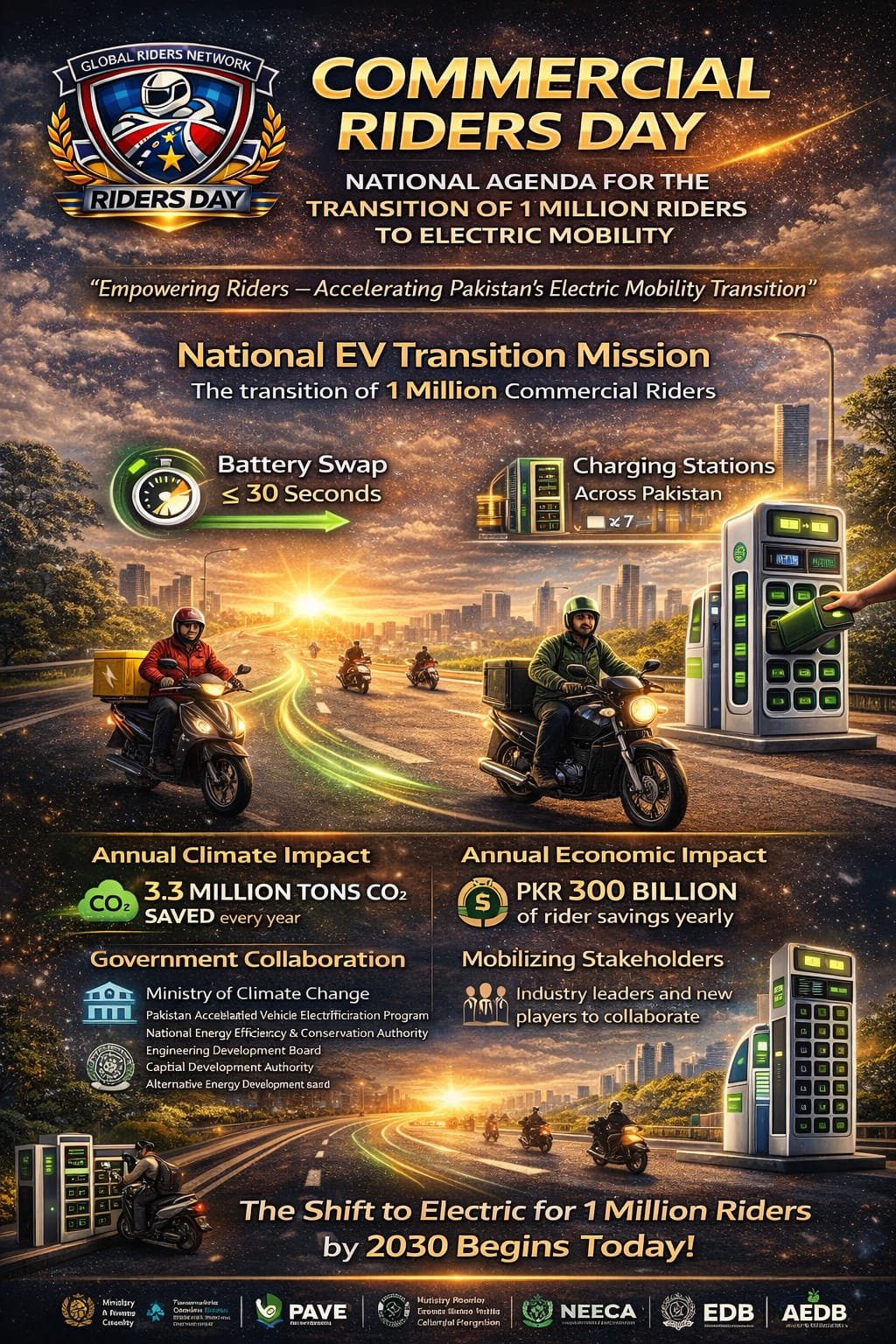 Islamabad – 15 March 2025 (Adnan Hameed): Pakistan will observe its first-ever Commercial Riders Day soon, marking the launch of a nationwide initiative aimed at transitioning one million commercial motorcycle riders to electric vehicles (EVs).